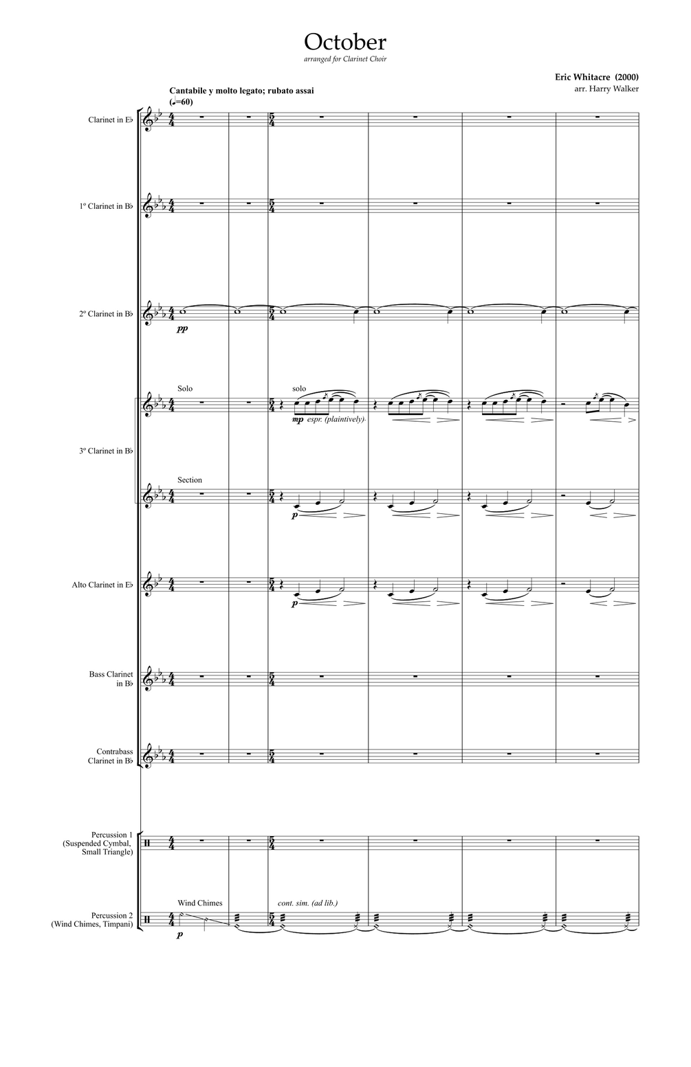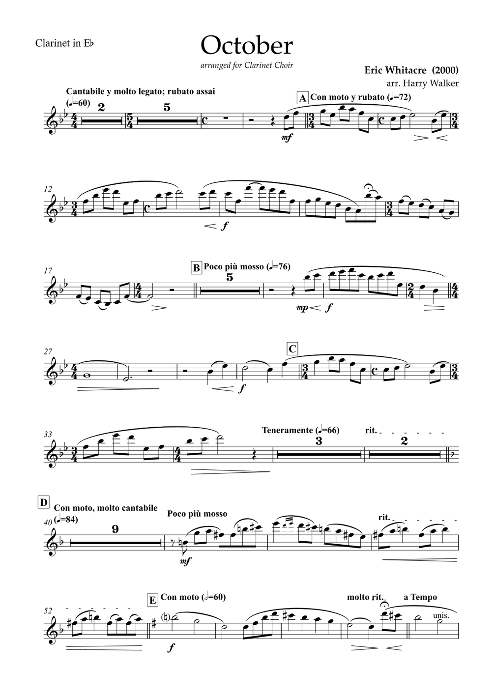 October is a musical reflection of stillness, change, and quiet beauty. Composed by Eric Whitacre, this work captures the crisp air and gentle melancholy of autumn. Through flowing lines, rich harmonies, and moments of serene suspension, it evokes the introspection that comes with fading light and falling leaves. It is not just a season, but a feeling — nostalgic, hopeful, and deeply human. In this version, the composition was arranged for Clarinet Choir by Harry Walker.